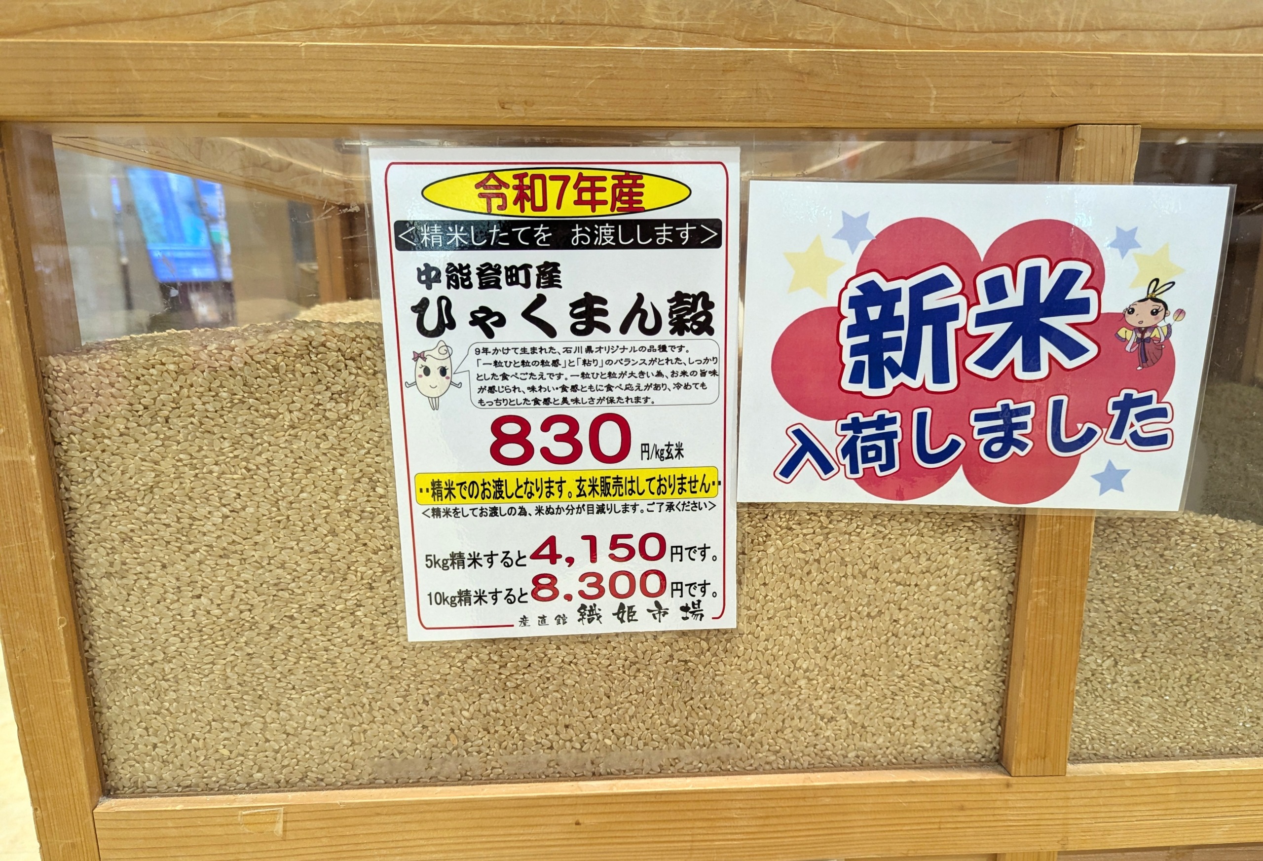 令和7年度「ひゃくまん穀」新米、販売開始! 2025.10.23 ブログ, 中能登産のお米 令和7年度産「ひゃくまん穀」の新米販売開始! 大変お待たせいたしました。令和7年度産「ひゃくまん穀」新米の販売を開始いたしました。 販売数量・ご購入数量ともに制限はございません。ご希望の量を安心してお申し付けください。 「ひゃくまん穀」は精米の「上白」のみでの販売となります。玄米での販売は行っておりませんので、あらかじめご了承ください。 ひゃくまん穀は、石川県が誇るブランド米です。粒が大きく食べ応えがあり、冷めてもおいしいため、おにぎりにもぴったりです。 また、コシヒカリはほどよい粘りともちもちとした食感、上品な甘みが特長の品種です🌾✨ 秋の味覚をいち早くご堪能いただけるこの機会に、ぜひご賞味ください。 ※ 現在、販売数量の制限はございません。※ 販売状況により、制限内容が変更となる場合がございます。※ 入荷状況により、販売価格が変動する場合がございます。あらかじめご了承ください。 令和7年度「能登米コシヒカリ」新米、販売開始! 関連記事一覧 【終了】2025年3月1日から肉肉フェア開催!紀宝町から柑橘の販売あり! 伊勢神宮ゆかりの米、イセヒカリで作った日本酒「神のおつげ」