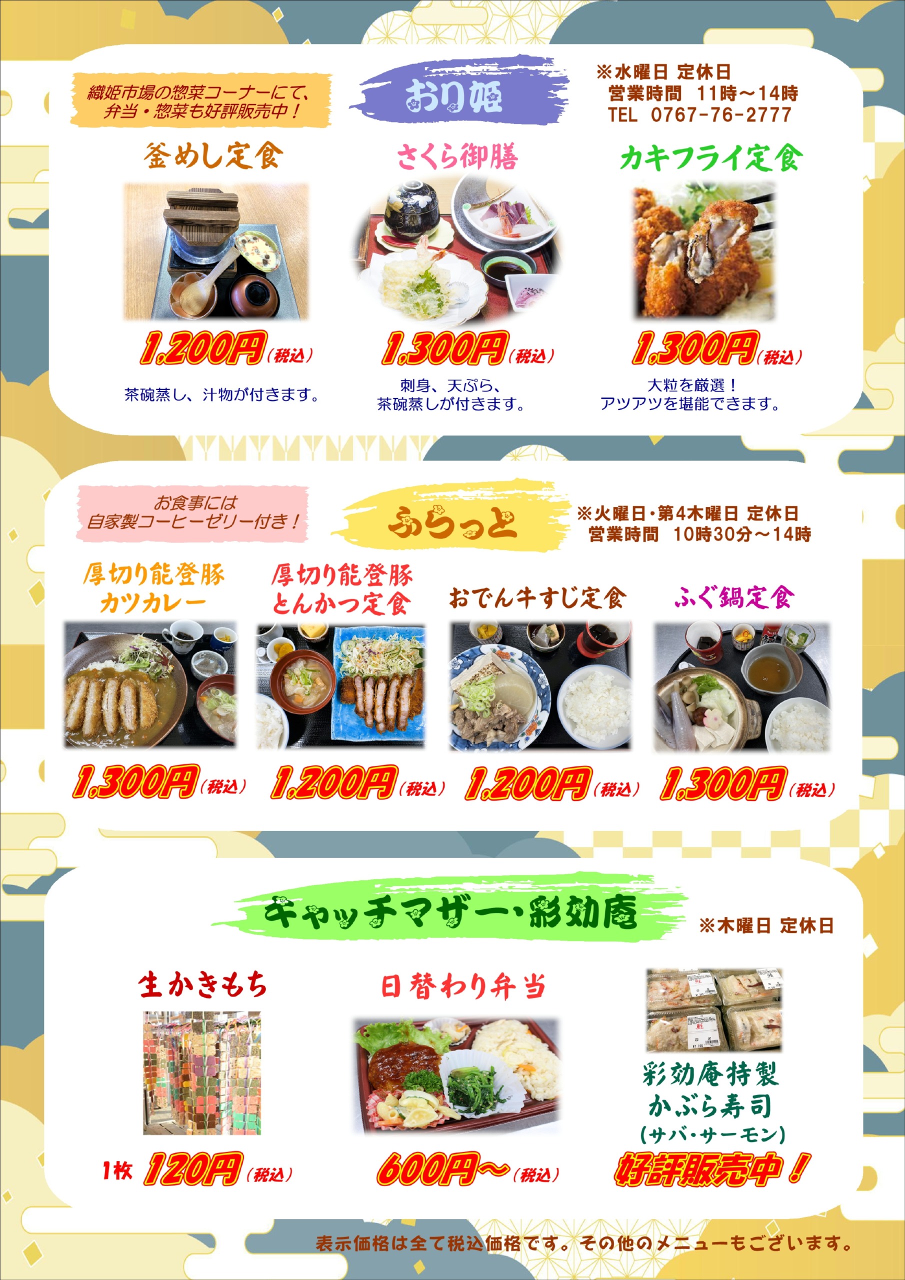 日替わり弁当や生かきもち、彩旬庵特製のかぶら寿司(サバ・サーモン)も好評販売中。